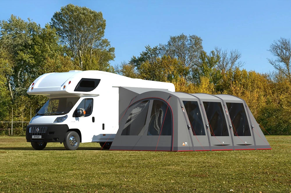 Designed for Touring, with the highly popular Airbeam design, making it perfect for quick-pitching, and quicker set-downs making it ideal for shorter camping trips and weekends away, due to the ease of pitching. The side connecting panel can also be neatly tidied away, should it be disconnected from the motorhome, and it comes with several different attachment types, though the most popular option is the 6mm Kador pre-attached thread, which fits into a fixing kit, and then into the wind out rail to the side of the motorhome.