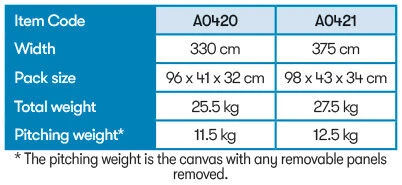 The Westfield Vega 330 is a modern luxury porch awning made with a top quality polycotton fabric but with a cotton like touch, it has a performance coating which is designed to withstand the elements, giving you an area of 330 x 250cm to use as an extra outdoor room, storage or bedroom space.